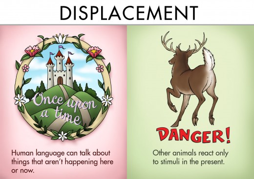Displacement | Humans can talk about remote, abstract, or imaginary things that aren't happening in their immediate environments. | Animal communication is context driven—they react to stimuli, or indexes. |