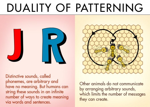 Duality of Patterning | Distinctive sounds, called phonemes, are arbitrary and have no meaning. But humans can string these sounds in an infinite number of ways to create meaning via words and sentences. | Other animals do not communicate by arranging arbitrary sounds, which limits the number of messages they can create. |