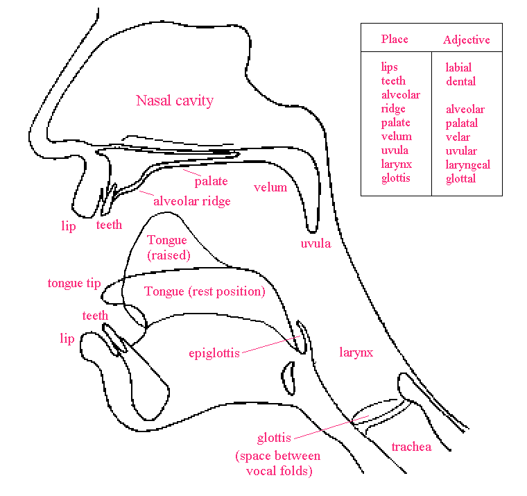 • Sounds can be divided into consonants and vowels. The former can be characterised according to 1) place, 2) manner of articulation and 3) voice (voiceless or voiced). For vowels one uses a coordinate system called a vowel quandrangle within which actual vowel values are located.