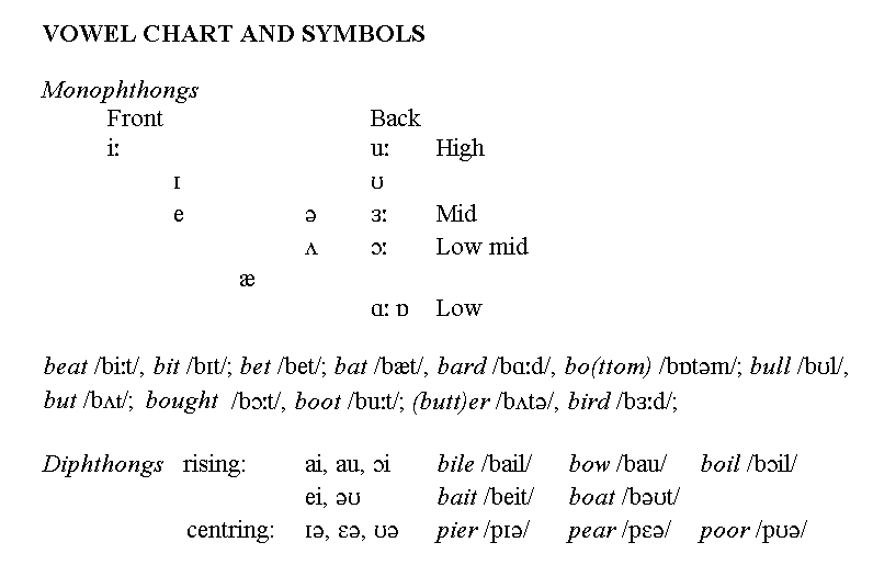 Note The left symbol of each is unrounded; the right one is rounded. There is a general correlation between unroundedness and frontness and roundedness and backness, i.e. these value combinations are much more common than their opposites. The following charts are given for the sounds of English; note that the values refer to Received Pronunciation and vary greatly between varieties of English.